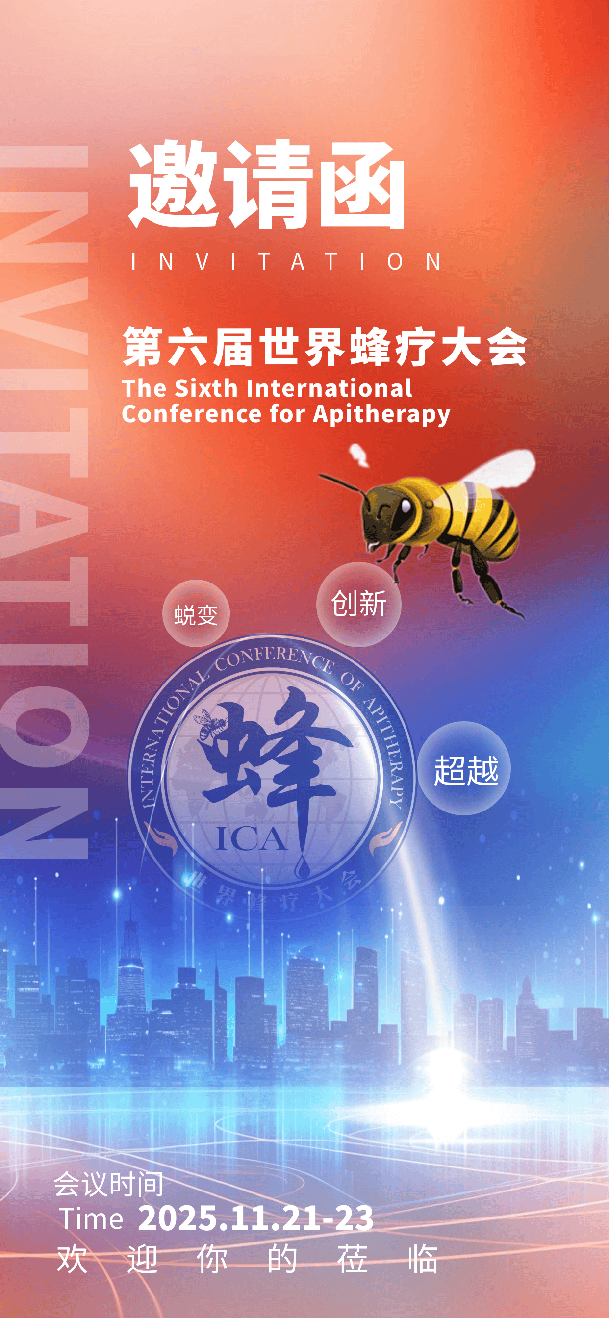 世界蜂疗大会(ICA)是一个面向全球蜂界高水平、高层次的世界性蜂疗学术大会和蜂疗产品博览会。作为行业引领者,不仅关注技术的创新,更关注健康产业的可持续发展。本次大会以“学术推动发展·创新引领未来”为主题,将深刻把握全球蜂疗产业的发展趋势,结合现代科技与中医蜂疗的传统智慧,致力于实现“人人享有健康,推动蜂疗融入全球卫生健康服务”的伟大使命而不懈努力。