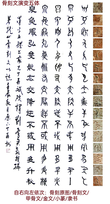 经过十年比对,张金栋发现丁再献破解的900余个骨刻文单字中,87%符合"五笔结构":横如地平线上的晨曦(一),竖似立柱撑起天穹(丨),撇是鸟兽迁徙的轨迹(丿),捺为江河奔涌的姿态(乀),点作星辰坠落的惊鸿(丶)。这些构成汉字的基本元素,在4600年前的骨面上早已写下胚胎。于是,他向丁再献提出了骨刻文中是否有五行八卦字型?丁再献肯定的回答:基本全有。于是,张金栋对900余个丁解骨刻文书法逐个按五笔结枸解音,形成了《了解骨刻文解音词典》系统。