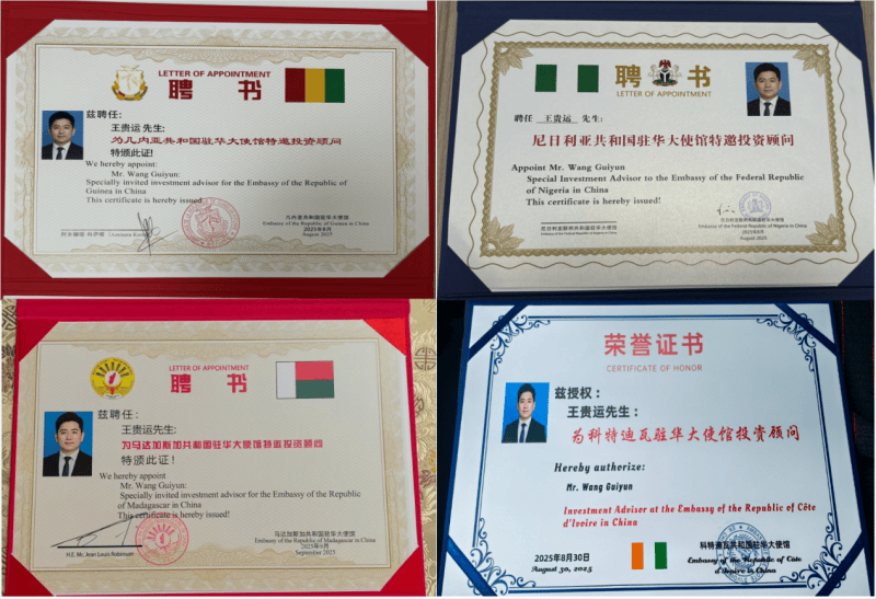 在全球经济格局深刻调整、中国金融市场不断扩大开放的背景下,香港远景未来投资管理股份有限公司再传喜讯:公司创始人兼董事长王贵运先生,近日正式受聘为几内亚、科特迪瓦、马达加斯加、尼日利亚等多国驻华大使馆特邀投资顾问。
