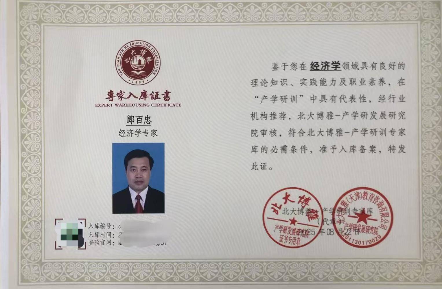 此刻,北大博雅—产学研发展研究院的授证仪式正庄严进行。一份编号为cxy20250822177的《专家入库证书》被郑重递出,郎百忠——这位兼具企业家的实干、思想者的深度与实践家的坚韧的行者,正式受聘为“北大博雅—产学研训高级智库经济学专家”;与此同时,另一份承载着认可的聘书亦送达手中,编号ypgj20250822175的“元培工匠专家谷客座教授”身份,为他的经济深耕之路,再添一枚厚重的注脚。这一日的夏末晨光、槐香与蝉鸣,都成了他记忆里最郑重的“八月印记”,镌刻着荣誉与使命的双重的力量。