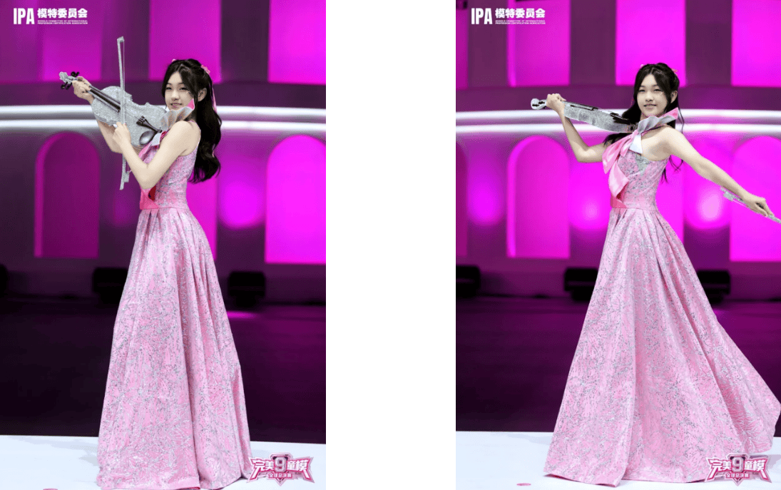 开幕式舞台上,Caprice Hue 邱瑞萱身着一袭华丽的粉色长裙,裙身闪耀着细腻的光泽,仿佛繁星点缀其上,尽显优雅与高贵。单肩处大大的粉色蝴蝶结装饰,为整体造型增添了几分甜美与俏皮。邱瑞萱手持一把精致的银色小提琴,搭配长长的指挥棒,展现出艺术的气息。她的发型精心打理,发丝柔顺地垂落,发间点缀着小巧的装饰,与服饰相得益彰。脸上洋溢着自信的微笑,眼神明亮而坚定。粉色长裙在她的走动下轻轻摇曳,仿佛一朵盛开的花朵。她用优雅的姿态和自信的展示,为开幕式增添了一抹亮丽的色彩。