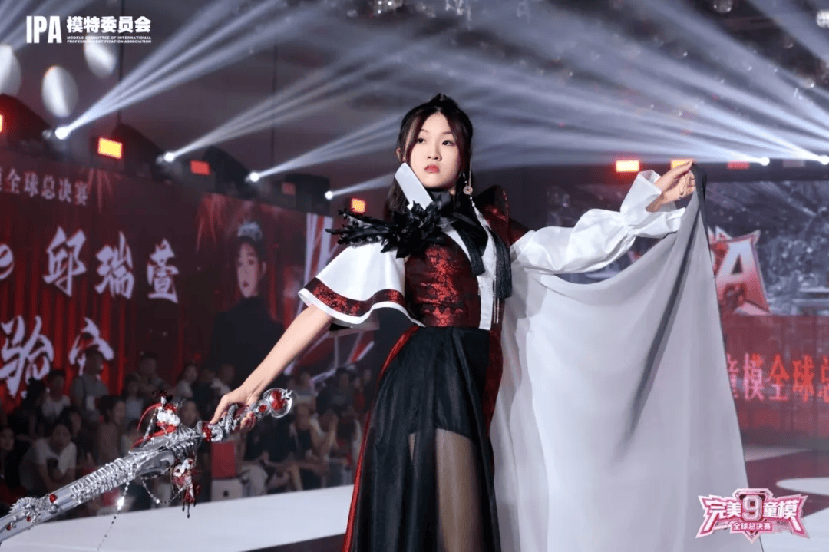 樱歌令展示环节,Caprice Hue 邱瑞萱身着一套极具风格的服饰。白色衬衫搭配华丽的酒红色马甲,马甲上的精致花纹尽显典雅。下身的黑色长裤与酒红色相衬,时尚又稳重。背后的红色披风在走动间飞扬,增添了几分飒爽与豪迈。随着音乐响起,邱瑞萱步伐坚定地走上舞台。她身姿挺拔,眼神坚定而自信,每一个动作都散发着独特的魅力。长剑挥舞间,红色披风飘动,将“樱歌令”的主题诠释得淋漓尽致,现场观众的目光紧紧追随,为她的精彩表现所折服,成为总决赛舞台上令人难忘的瞬间。