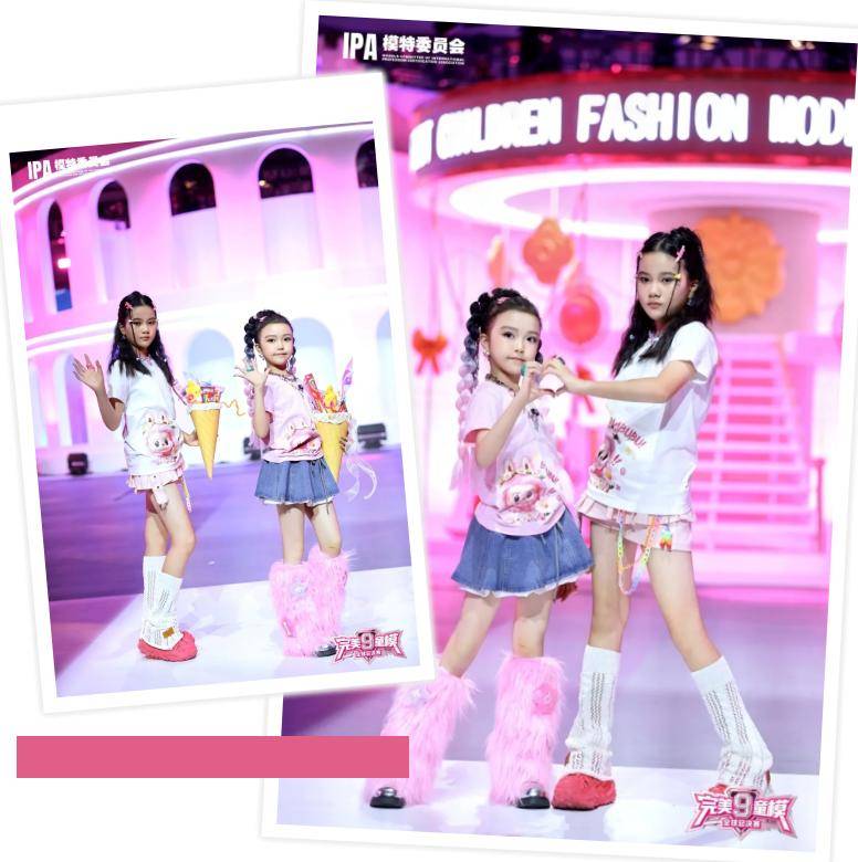 双人搭档秀,米淇米身着印有可爱图案的白色 T 恤,搭配俏皮短裙,简约又不失时尚感。长长的白袜搭配亮眼的红鞋,个性十足。她手持装满糖果的巨型甜筒道具,仿佛从童话中走来。她每一个转身、每一次抬眸都散发着独特魅力。与许灵月默契配合,两人宛如舞台上的双子星,共同演绎童真与时尚的融合。将活力与朝气尽情释放。她以灵动的姿态和灿烂的风采诠释着童模的无限可能,为这场搭档秀增添了一抹绚丽且难忘的色彩。