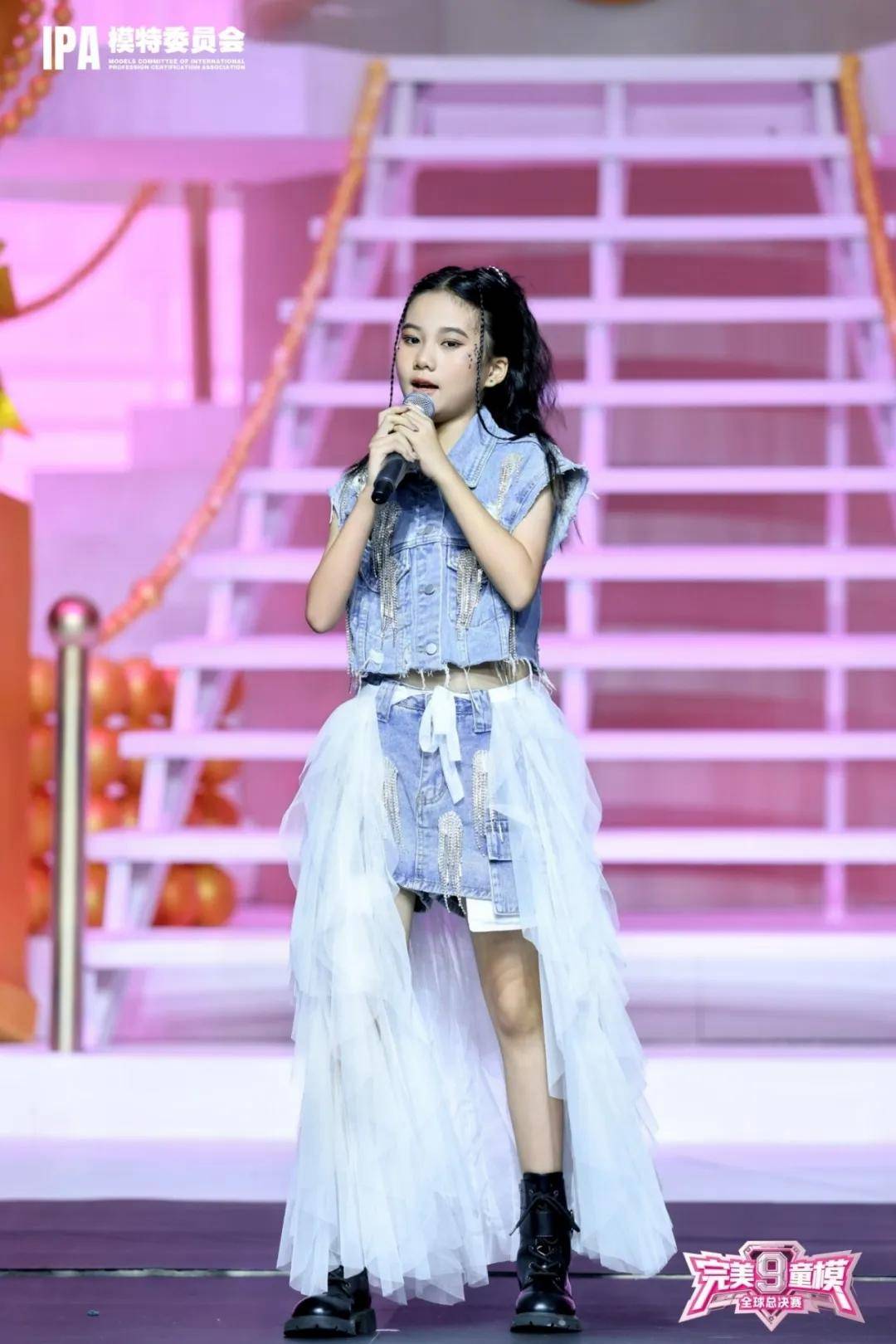 在第九季完美童模全球总决赛现场,米淇米《无畏的冒险》首发单曲见面会燃情开启。米淇米身着别致牛仔套装亮相,短款马甲搭配个性短裙,灵动的白纱装饰增添梦幻感。她手持话筒,眼神坚定自信,用清澈且富有感染力的嗓音唱响《无畏的冒险》,每一个音符都传递着勇气与力量。台下粉丝们热情高涨,手臂挥动,随着旋律轻轻摇摆。