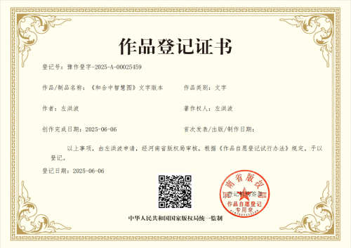 《和合中智慧图》是继《河图》《太极图》之后的中华第三图,2025 年在中华人民共和国国家版权局、河南省版权局进行了认证登记。该图的诞生是教育部“十四五”教育科研规划全国重点课题《和合中一分三视角下的全球化——政治权利、经济发展与社会责任》课题组的创新成果, 是中华优秀传统文化创造性转化、创新性发展的绚丽篇章。“和合中文化”是中华文明的精髓,为中华民族生生不息、不断发展壮大提供了重要精神力量。这种责任与担当跨越时空仍在当今的新时代鸣响,在 21 世纪为人类文明贡献更多“和合共生”的中国智慧,为人类命运共同体提供了深厚的理论基础和实践方案。